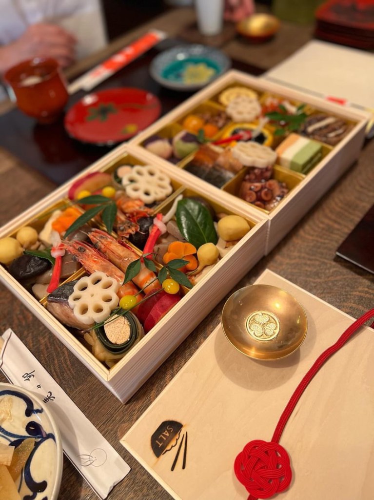 You get together with your family and drink sake called “otoso” and the meaning behind drinking it is that it will flush away any bad luck or misfortune from the previous year. You also eat a New Year’s meal called “Osechi,” made with traditional Japanese cooking, specially prepared for the celebration. It is placed in a square box called “Jyuubako,” in which appetizers are placed in the highest box, the second box contains primarily seafood, and the third box holds a mountain of delicacies. Some of the meanings behind the osechi are black beans called “kuromame,” representing the ability to live a healthy life, and the lotus root called “renkon,” which allows you to see the future. Each ingredient holds a different meaning.